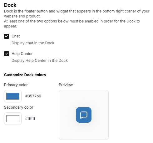 The Dock is the floating widget that appears in the bottom-right corner of your website and product. It serves as a central, accessible point for your end-users to engage with your support tools, such as the Chat and Help Center. The behavior and appearance of the Dock are managed from your Project Settings page.
